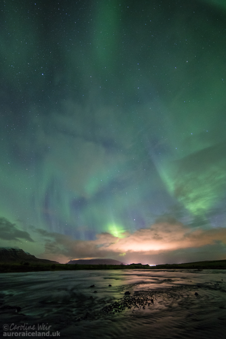 A strong geomagnetic storm occurred this evening, due to enhanced solar winds from a coronal hole. Some activity kicked off in Iceland even before it was fully dark, and that turned out to be the strongest display of the night (at least for the period I watched, until midnight) with dancing curtains and intense greens to the eye. Unfortunately we were driving at the time, and while I had excellent naked eye views of the aurora display overhead then there was nowhere on the road to pull over and take photographs because of so many other people also parked up to watch the lights! So the images below are from a bit later in the evening and after the strongest part of the display had mostly moved southwards from Iceland. Over this period the aurora covered much of the sky but at much lower intensity and without too much movement. We even had a nice band of aurora across the southern sky, instead of in the north like usual.